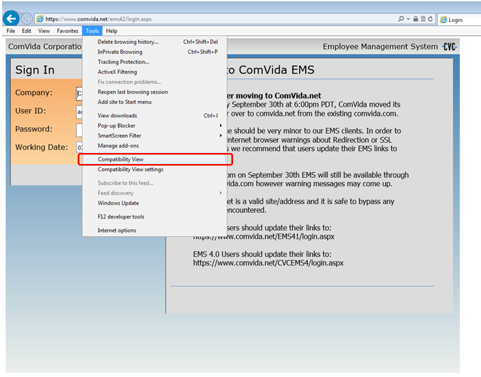 If you access EMS through an intranet (EMS is self-hosted), please make sure that 'Display intranet sites in Compatibility view' is unchecked.