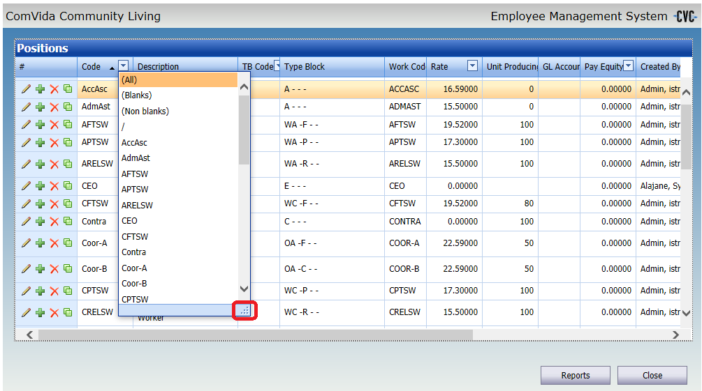 Each grid has a small dropdown button next to "Code" in the header. To view a list of all of the "Codes", click the button: ![]()