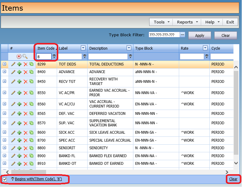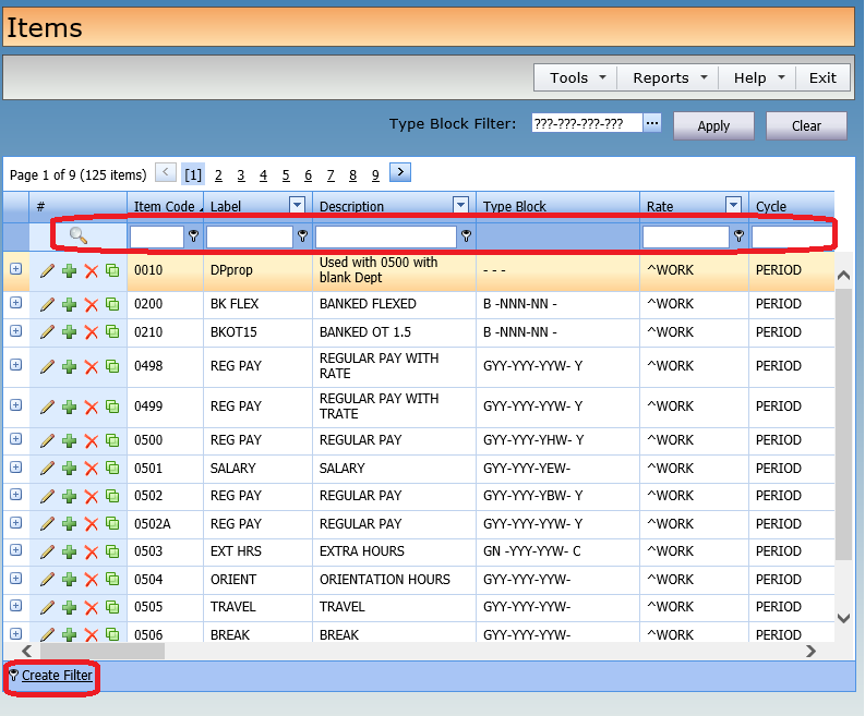 Filtering the data contained in a grid provides a powerful way to focus on a particular set of codes, items, reports, etc. Some grids include a direct link to the grid filter below the grid and/or empty fields below the grid header for filtering on selected columns.