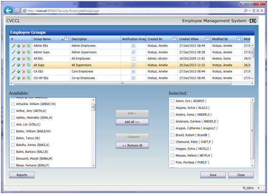 3. Go to Security | Employee Groups and review the groups of employees. If any groups will be receiving notifications, update them and check the Notification Group.