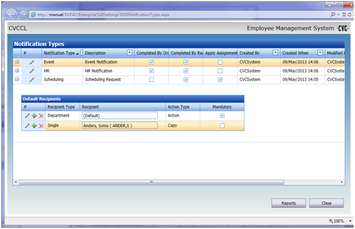 4. Go to Enterprise Settings | Notification Types and set Default Recipients for each Notification Type. To view and update the Default Recipients, expand the Notification Type by clicking the plus sign to the left of the row.