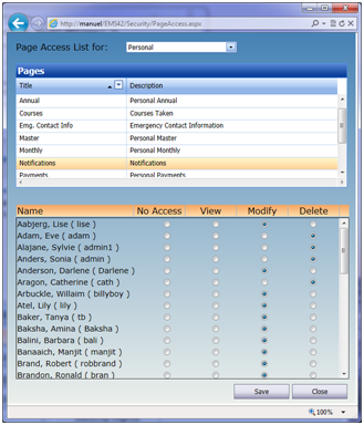 5. Go to Security | Page Access and give the operators appropriate access to the Notifications pages. There are 3 Notifications pages, the most commonly used ones will be in Personal and in Scheduling. The Notifications page in HR displays notifications sent to and received by each employee.